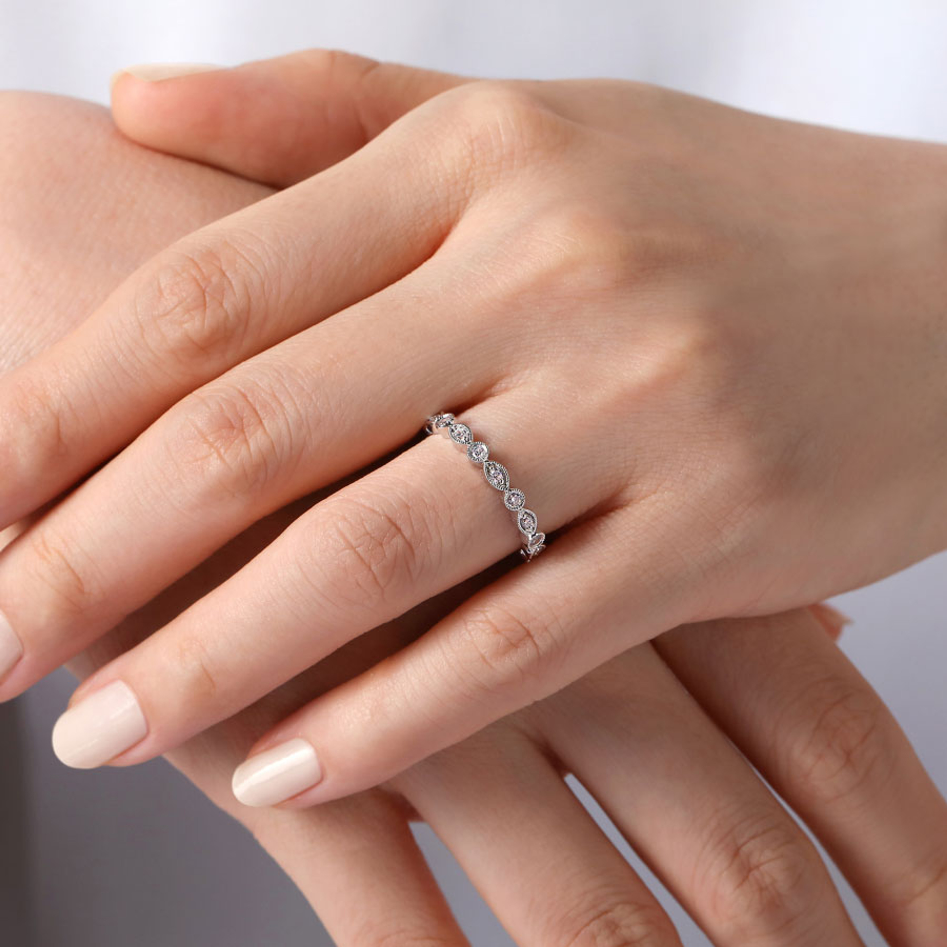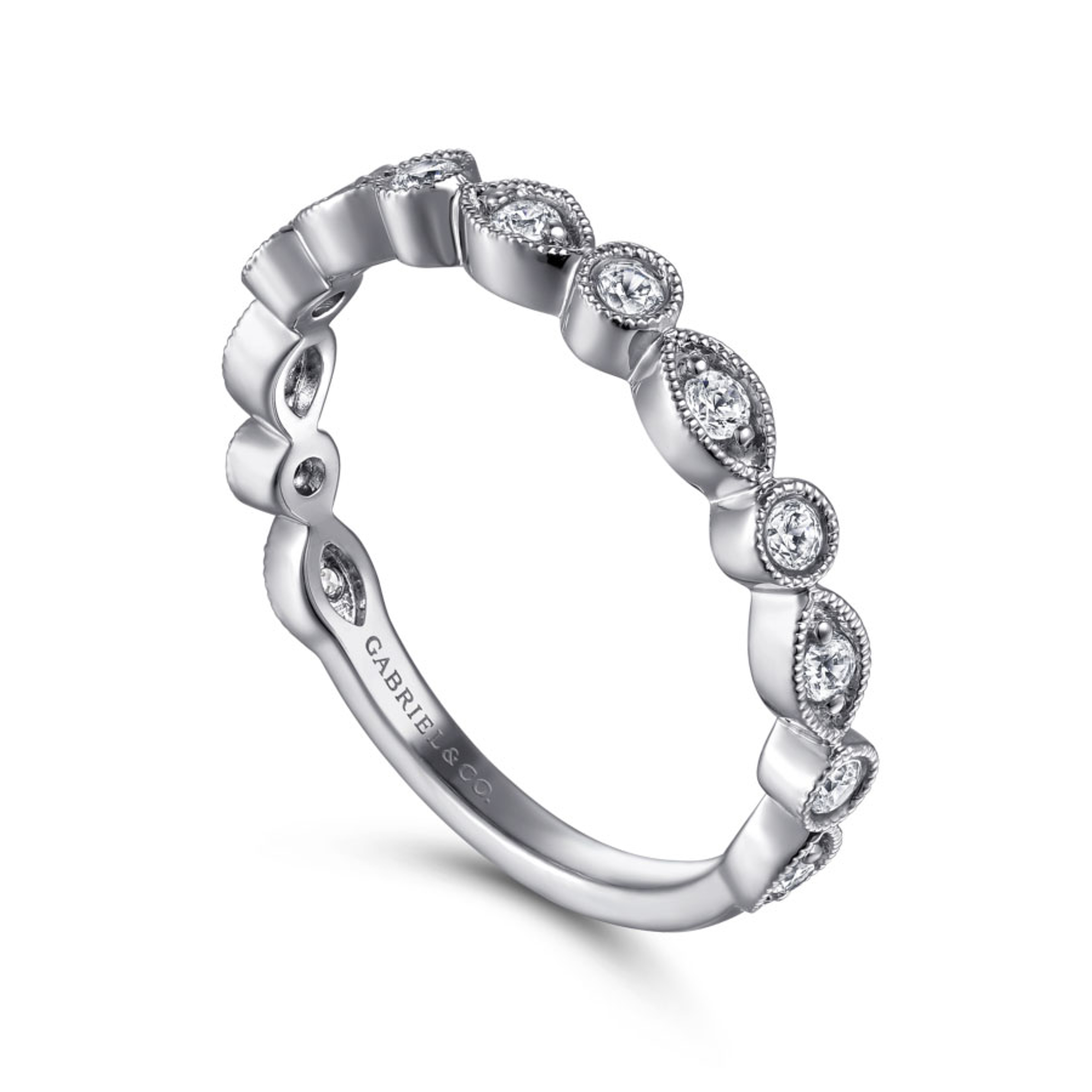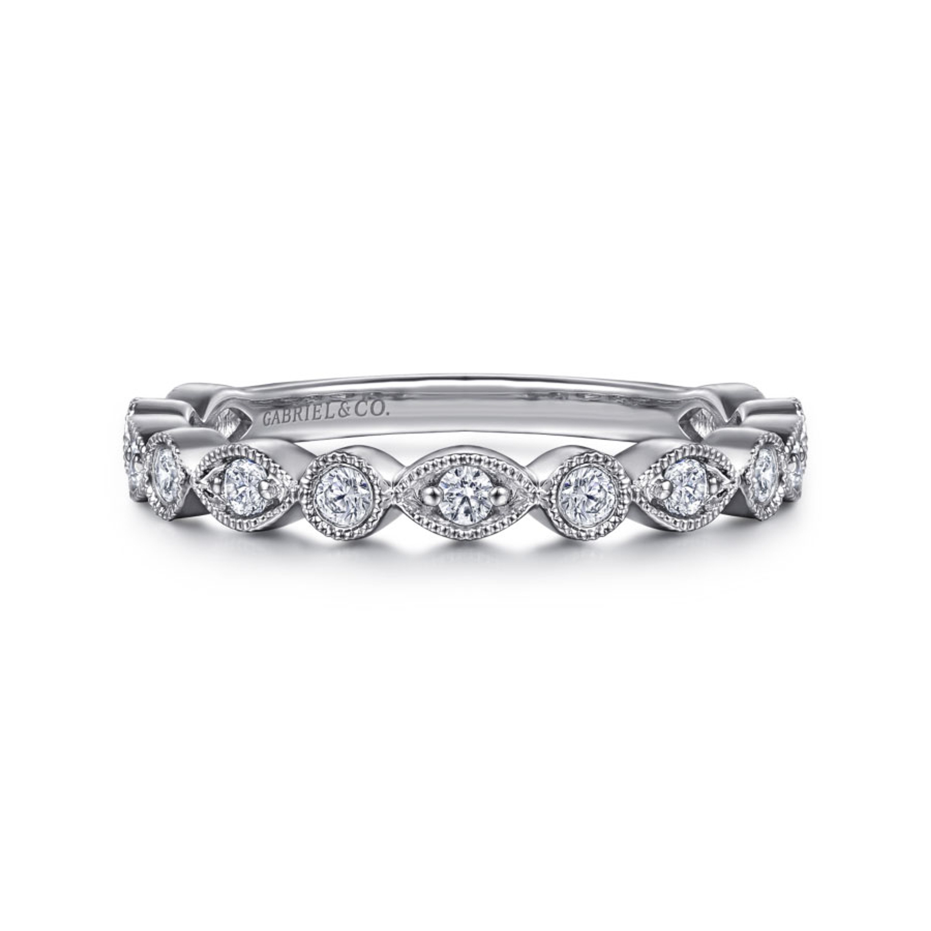 This dazzling ring features a row of bezel set diamonds in a marquise and round shape band with milgrain detailing that extend two-thirds of the way around the band.