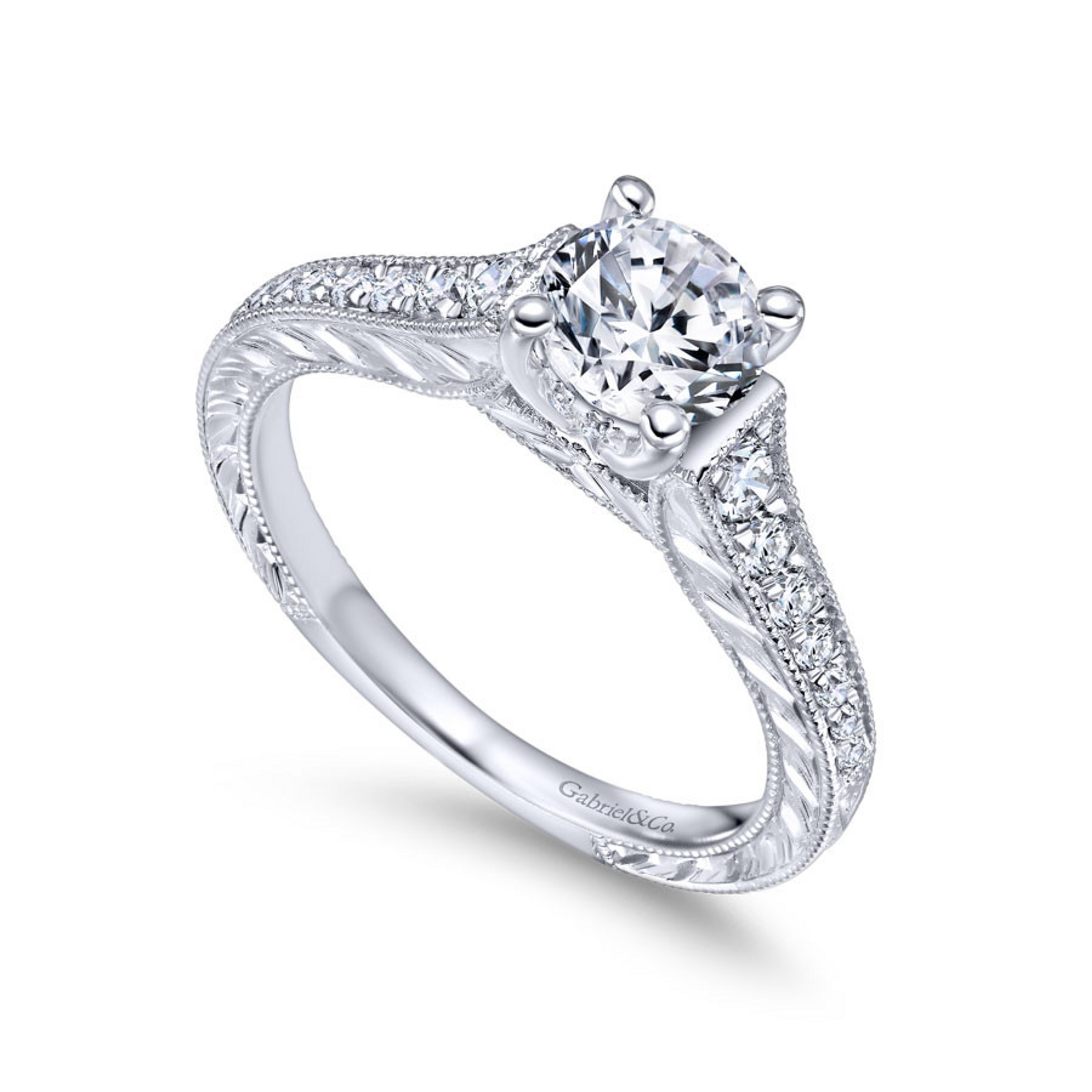 Your center stone will truly shine in this setting with a reverse tapered band of channel set pave diamonds with milgrain and engraved detailing. Setting only (center stone sold separately).