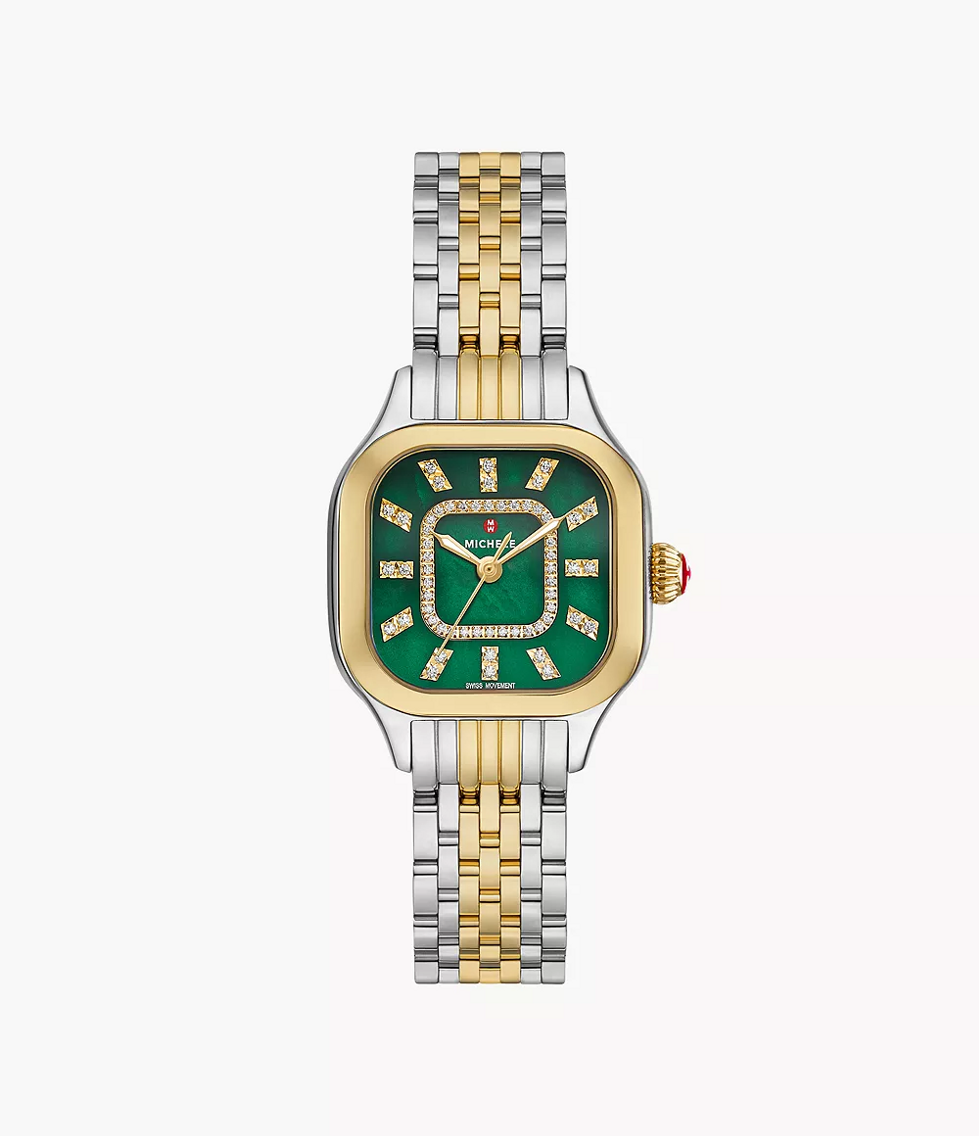This two-tone 18K Deco Madison Mid shines with 40 hand-set diamonds atop the silver white sunray dial. The two-tone 18K gold bracelet is made specifically for the Deco Madison Mid collection and is interchangeable with any 16mm MICHELE strap.