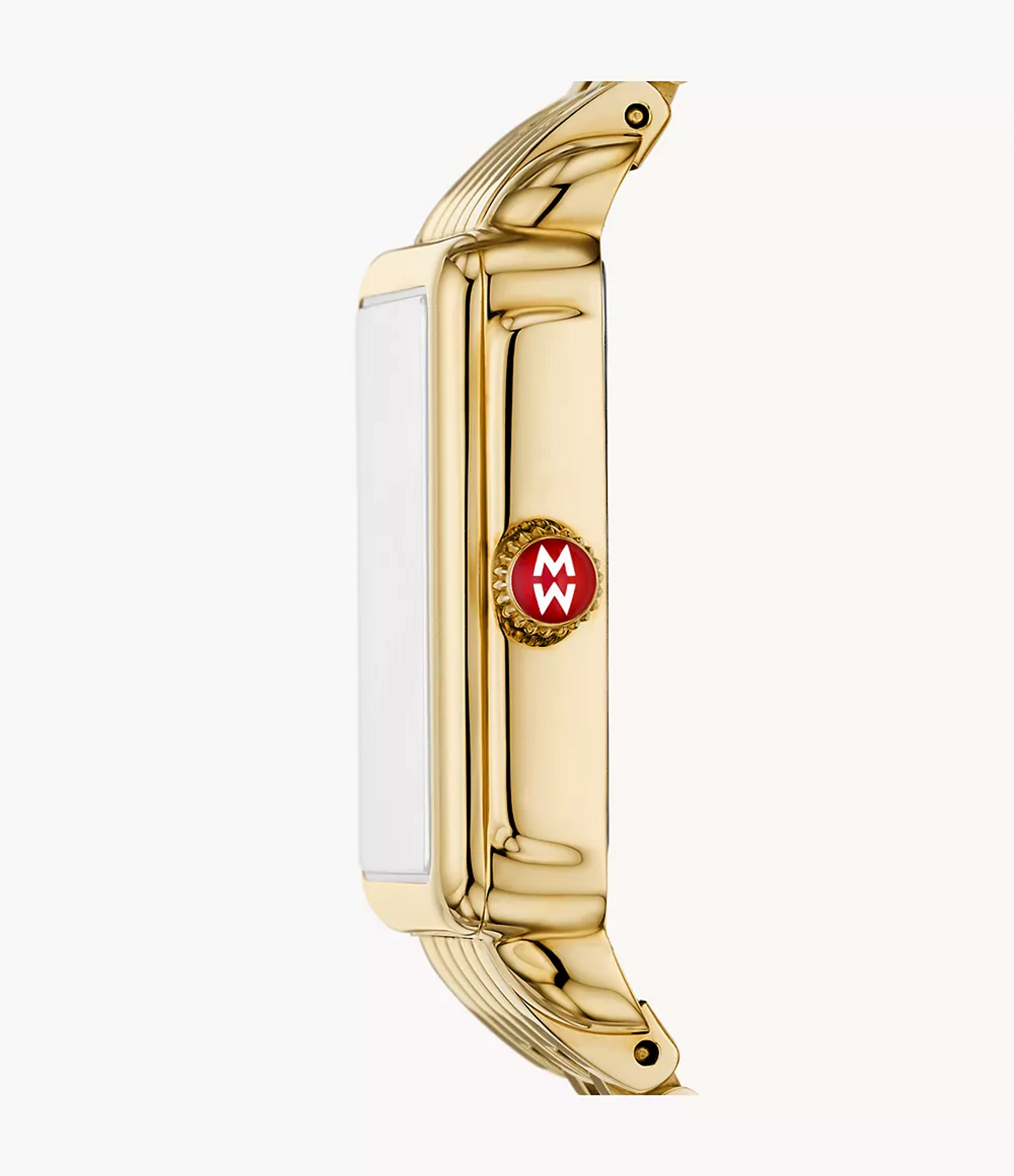 Elegant and architectural, this rectangular watch from the Deco Park collection perfectly balances form and function. The dark cherry mother-of-pearl dial is housed within a 18K gold-plated case and Swiss movement. The 18K gold-plated bracelet is made specifically for the Deco Park collection and is interchangeable with any 14mm MICHELE strap.