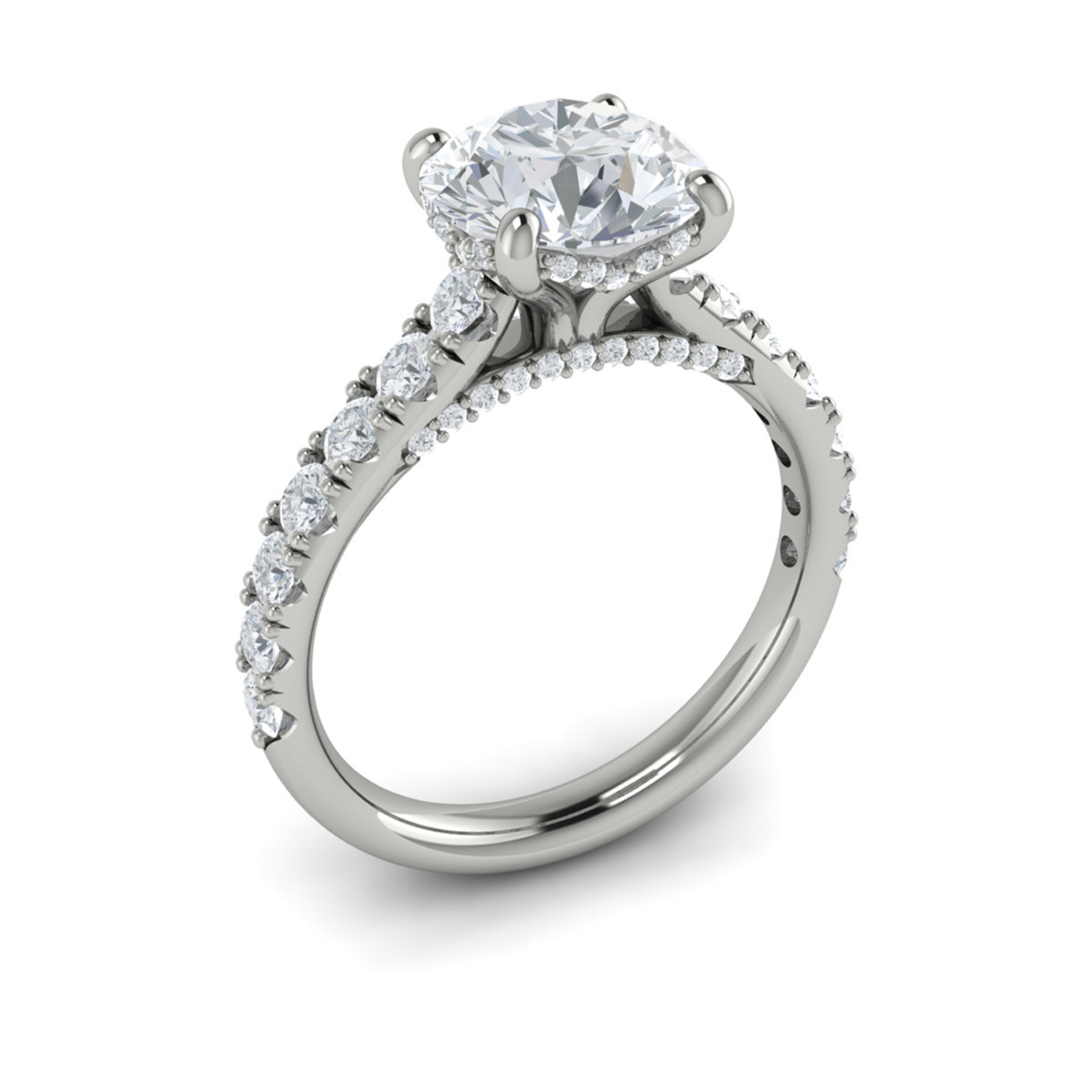 Setting only (center stone sold separately). Image shows a 1 carat round center stone. The Kylie Hidden Halo Straight Setting features a sleek, straight band that subtly frames the center stone, while an enchanting hidden halo of diamonds adds a layer of secret sparkle.