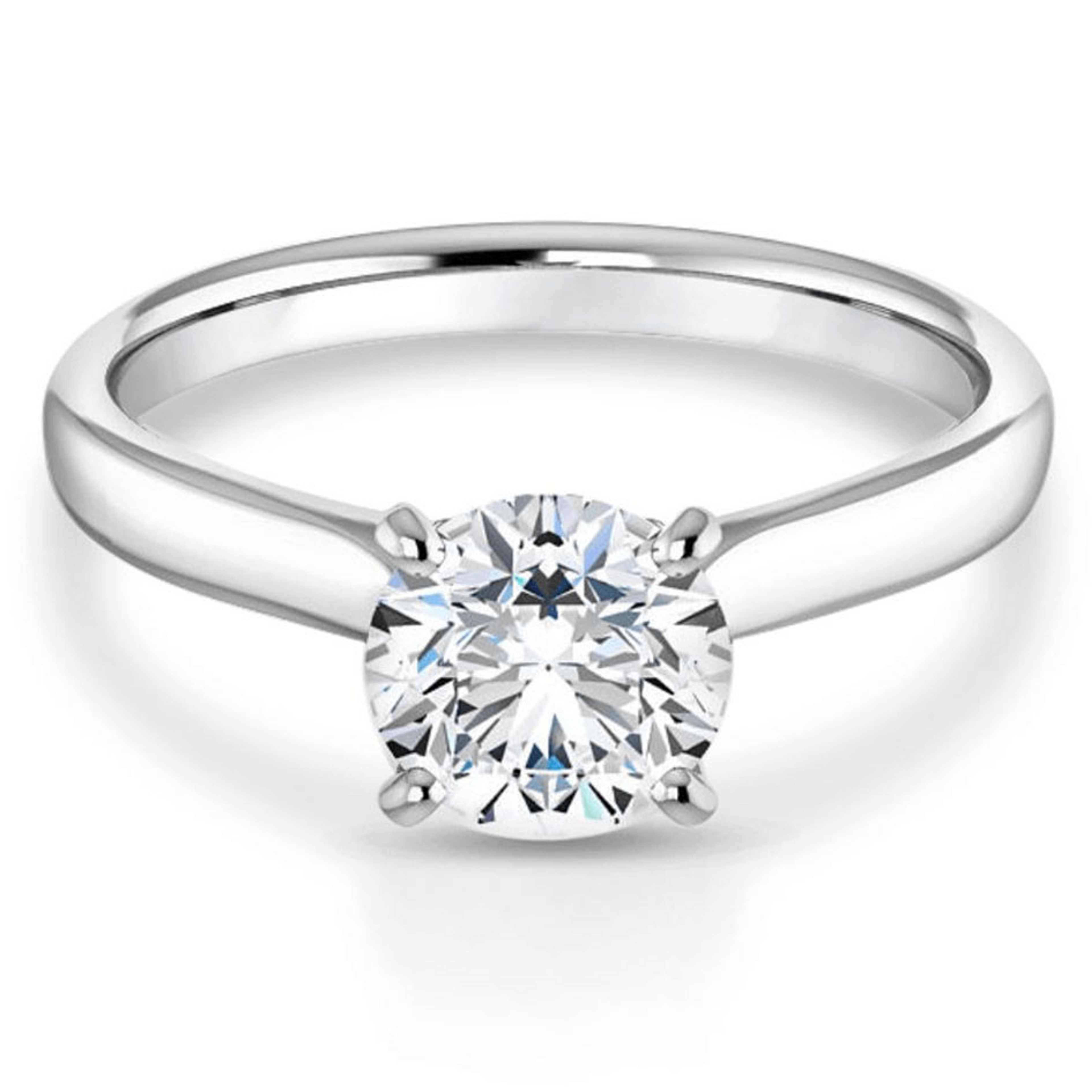 Big and bold on top, sleek and slender on the bottom. Your partner will get the best of both worlds with this beautiful engagement ring setting. The stunning solitaire setting features an ultra polished band that tapers as it elegantly wraps around your finger. The chunkier top perfectly supports a bold and breathtaking center stone of your choice.  Setting only (center stone sold separately). Image shows a 1 carat round center stone.