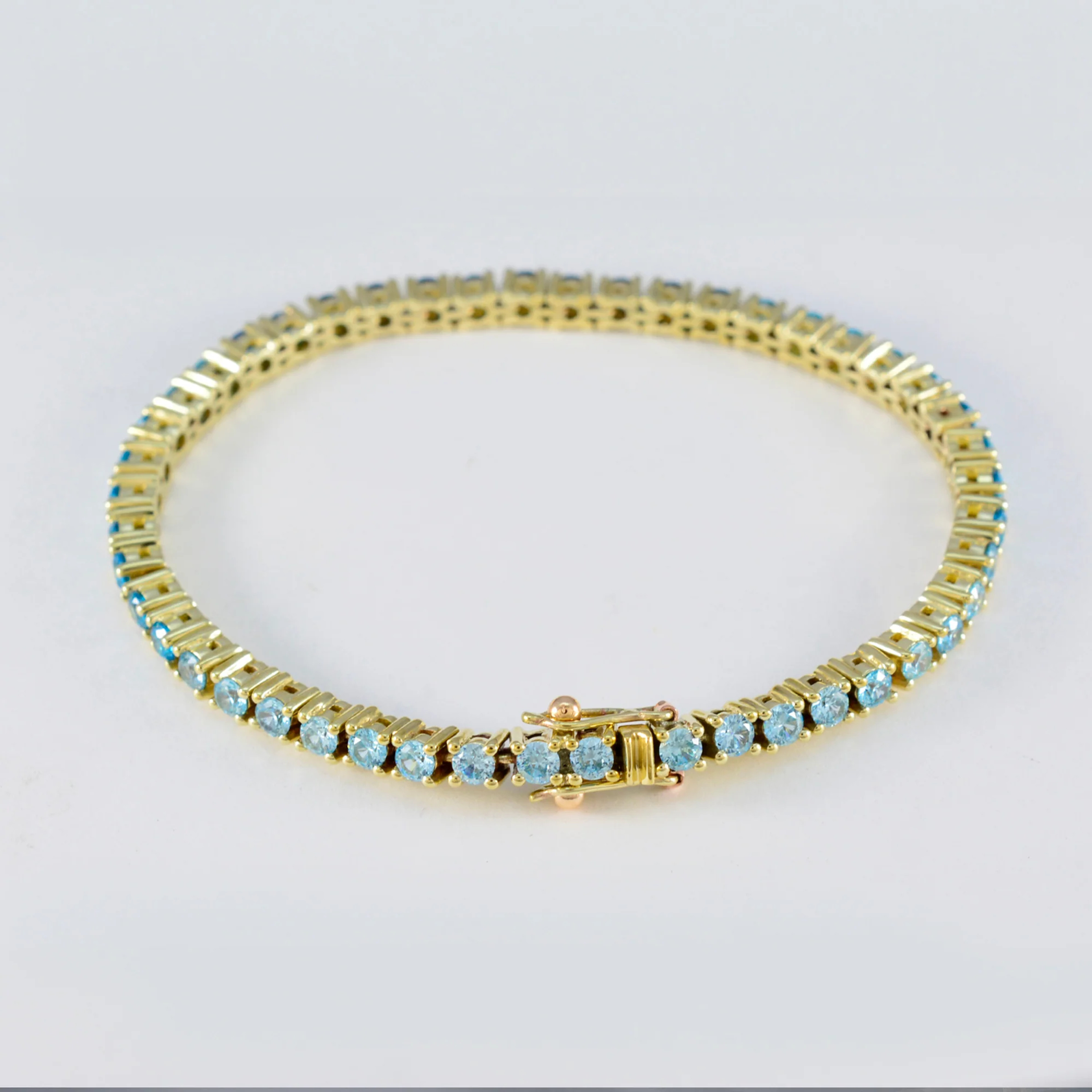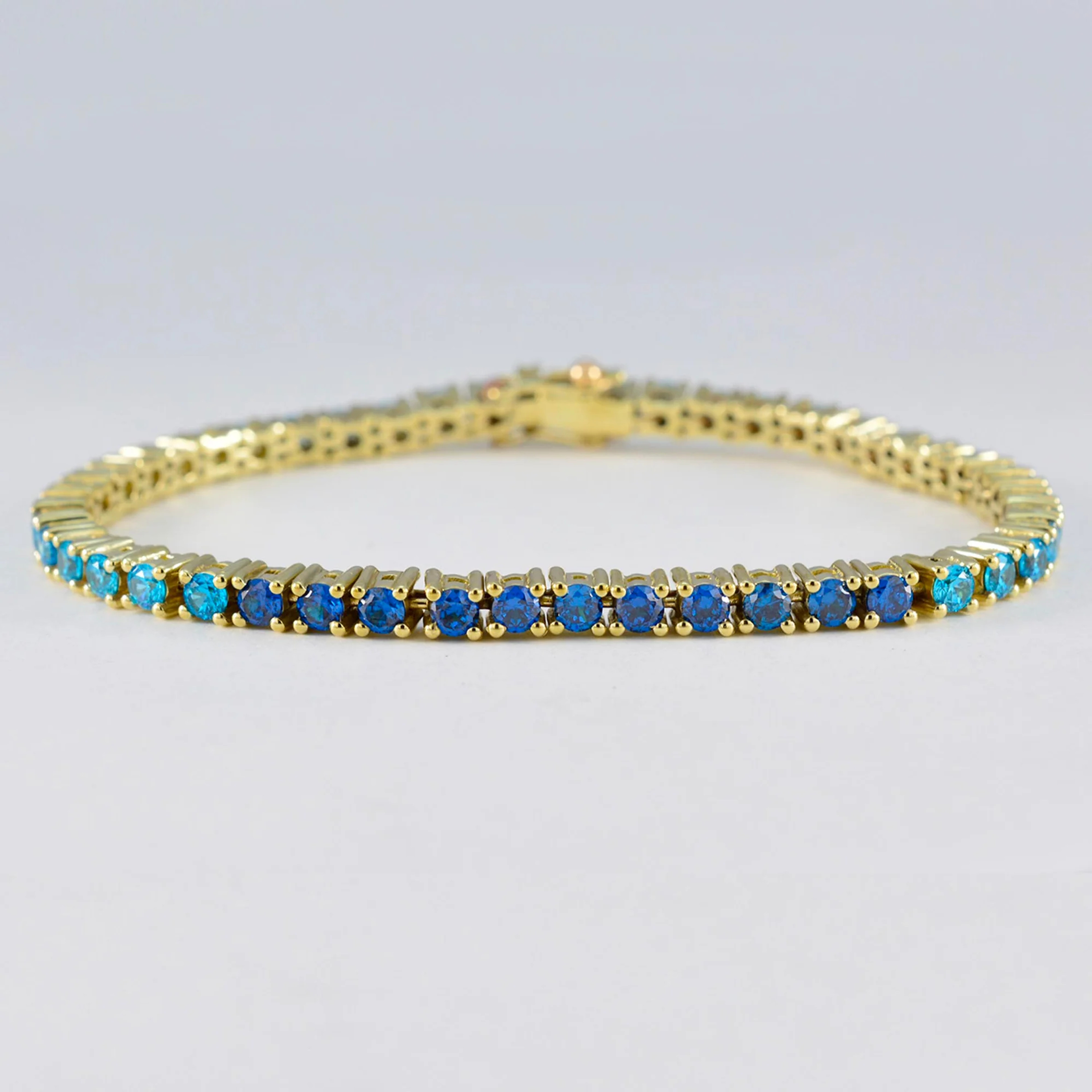 Meticulously designed, this bracelet showcases a seamless sequence of enchanting blue topaz gemstones, delicately embraced by 18K yellow gold plating. Each captivating blue topaz, reminiscent of a clear summer sky, radiates a gradient of azure hues, creating an ombre effect that captures the essence of ethereal charm.