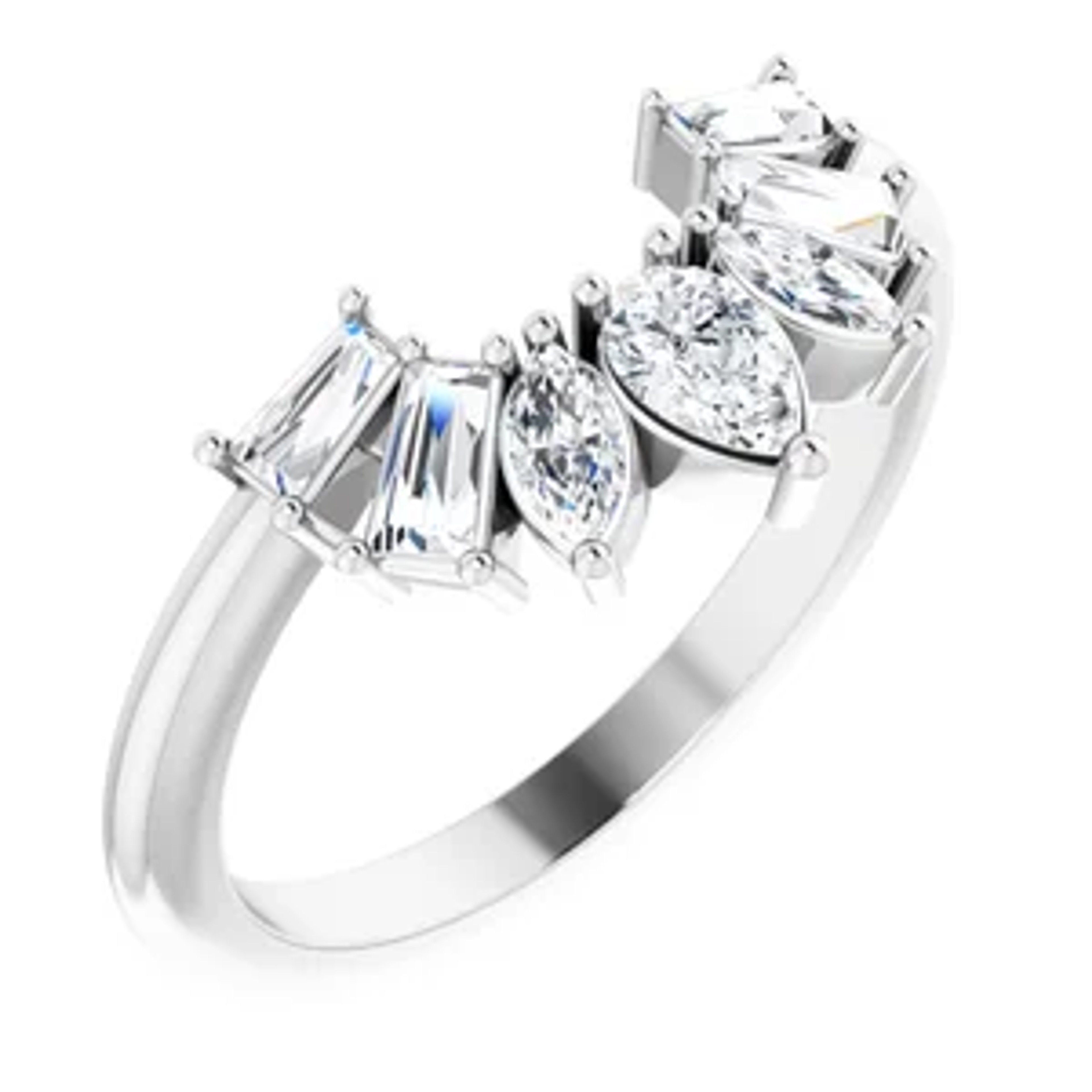 This extraordinary ring is a celebration of your unique journey, featuring a harmonious blend of diamond shapes that symbolize the many dimensions of your relationship. The contour of the band elegantly traces the contours of your finger, a metaphor for the paths you've walked together.