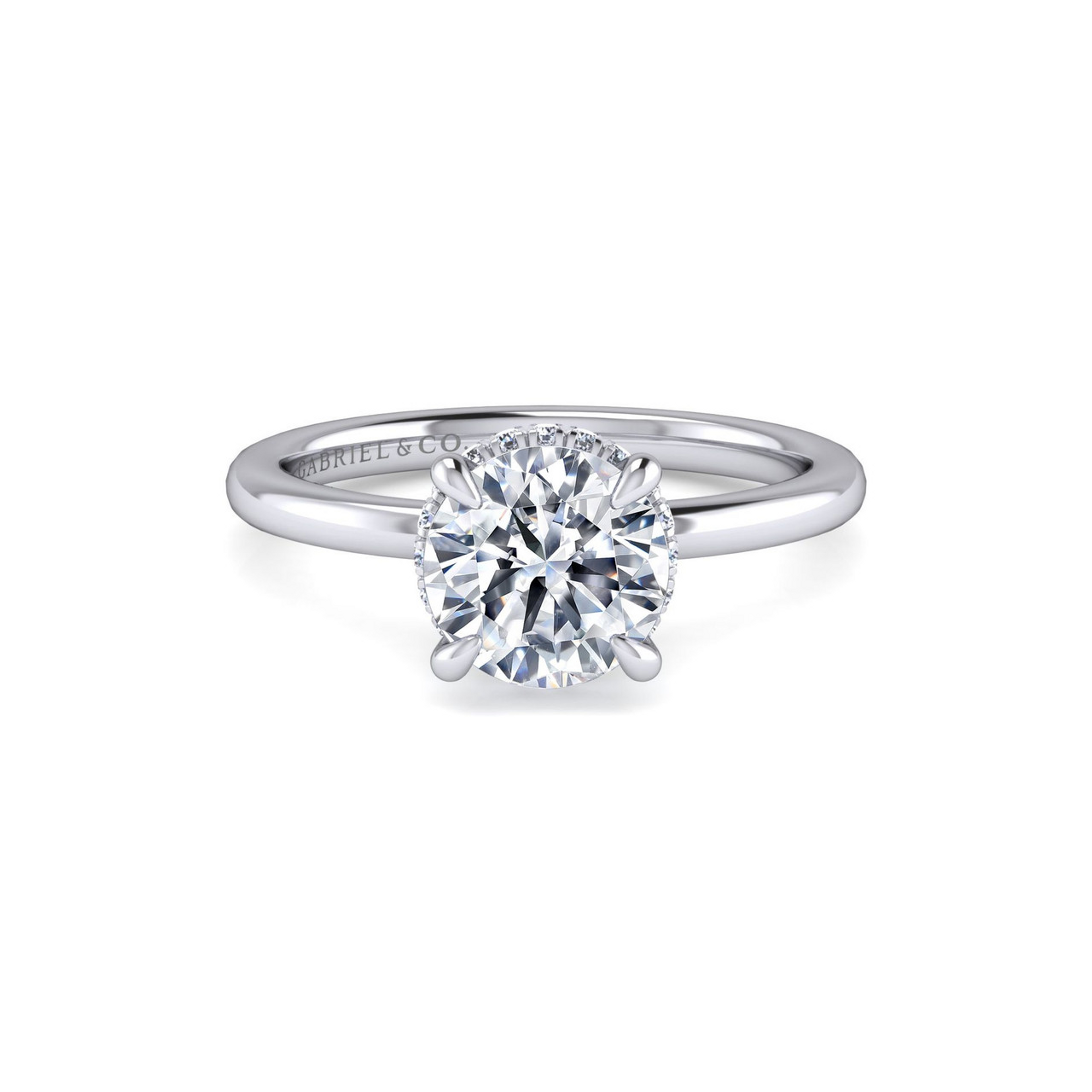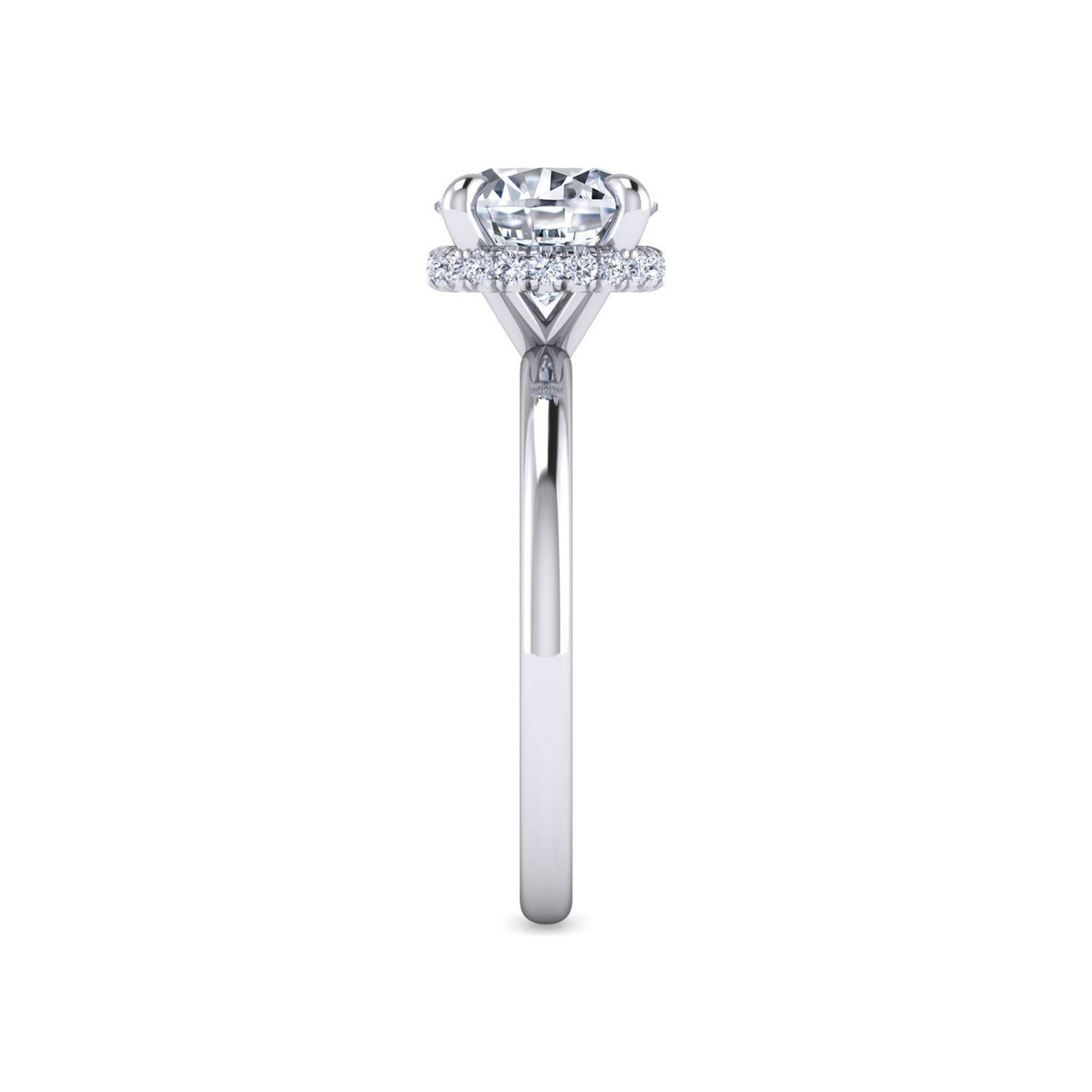An elegant engagement ring setting that radiates elevated simplicity. This ring features a smooth straight shank and a hidden diamond halo. Share the best kind of secret when you surprise them with this hidden halo engagement ring setting. Setting only (center stone sold separately).