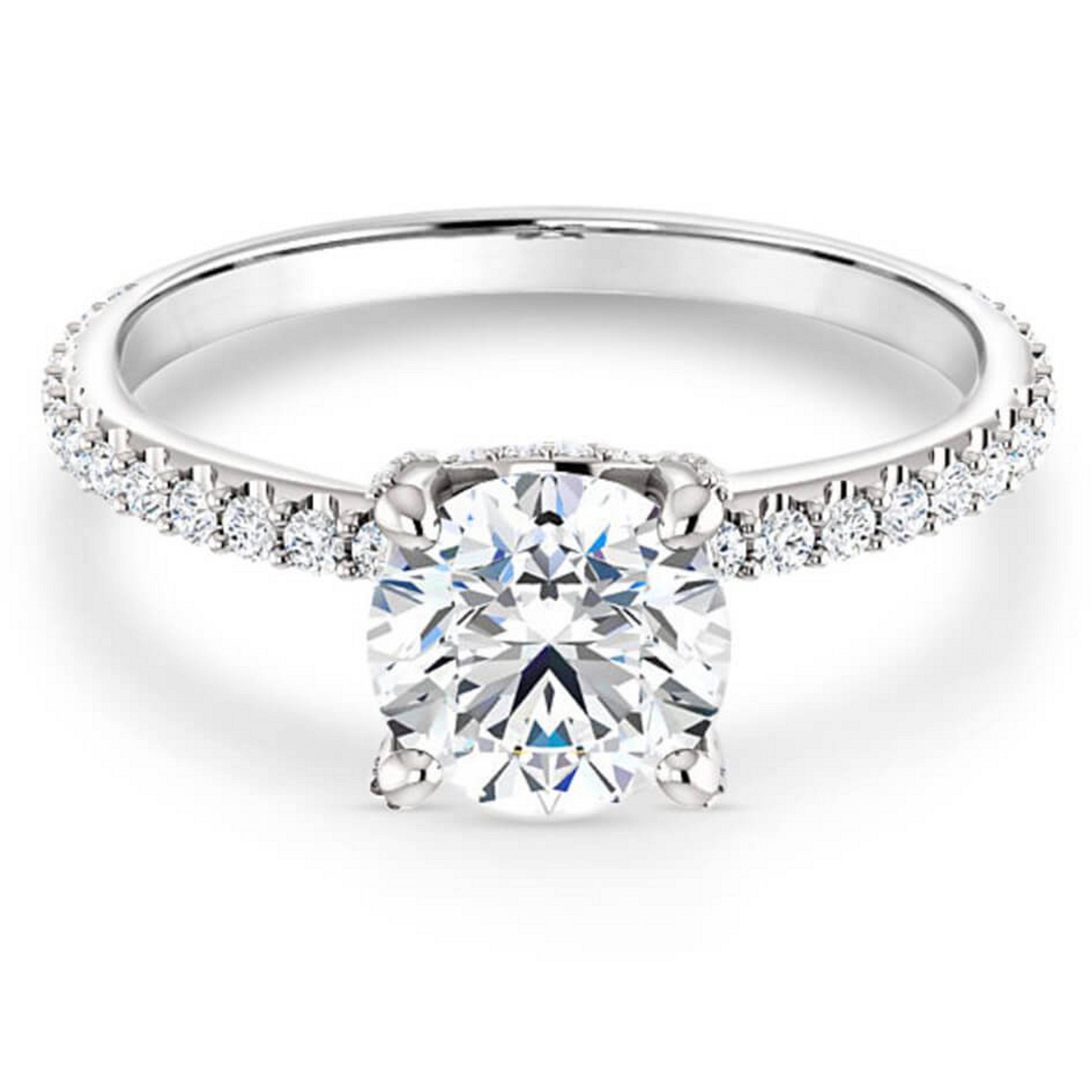 This modern setting features a halo of sparkling diamonds hidden underneath the center stone. Setting only (center stone sold separately). Image shows a 1 carat round center stone. Due to the intricately detailed design of the setting, this style requires additional care and upkeep to maintain the delicate pave stones in the head. It is recommended that you have your ring evaluated every 3-4 months by a professional jeweler to ensure the accent stones are secured and prongs are tightened. Click here to view video.