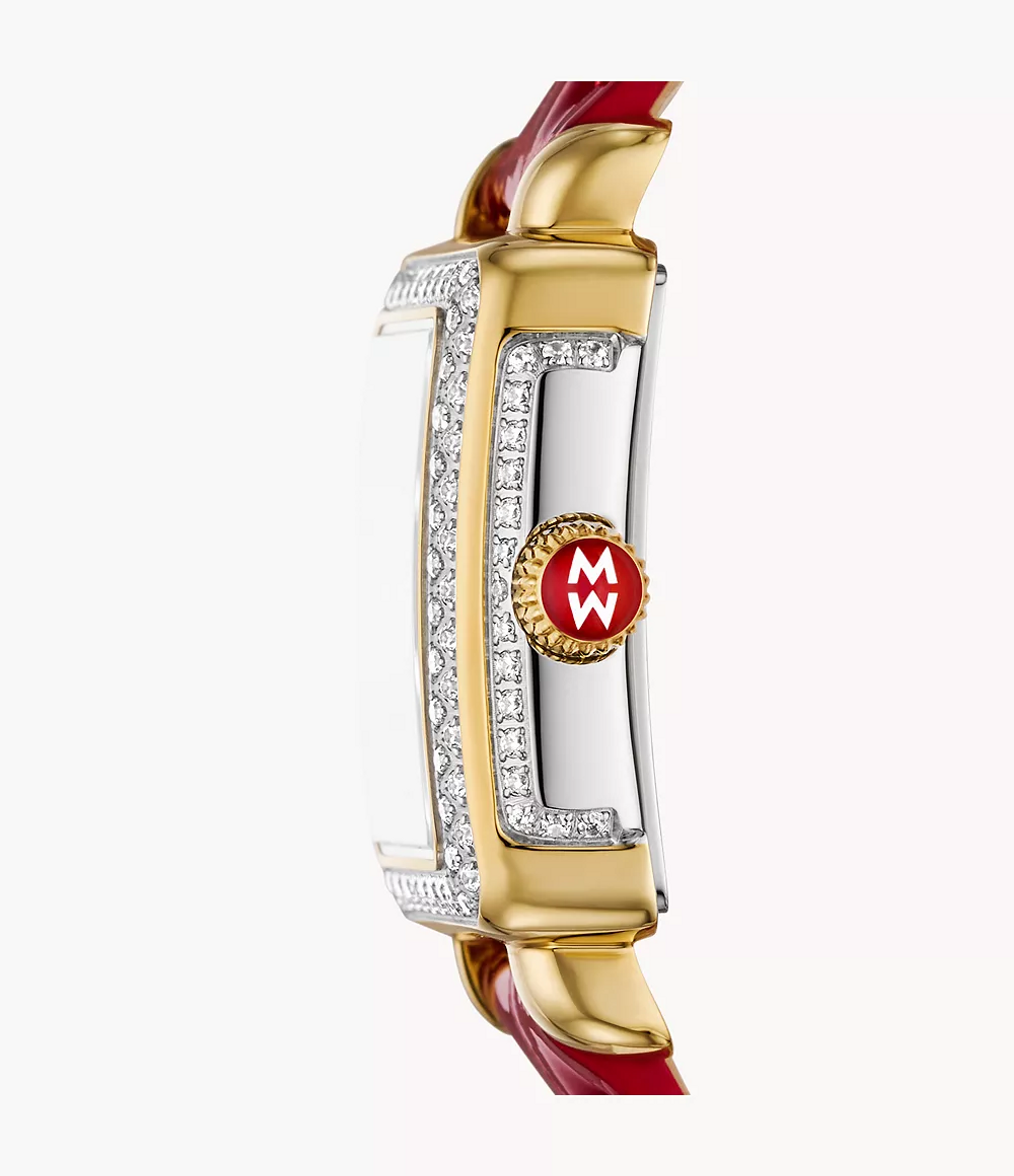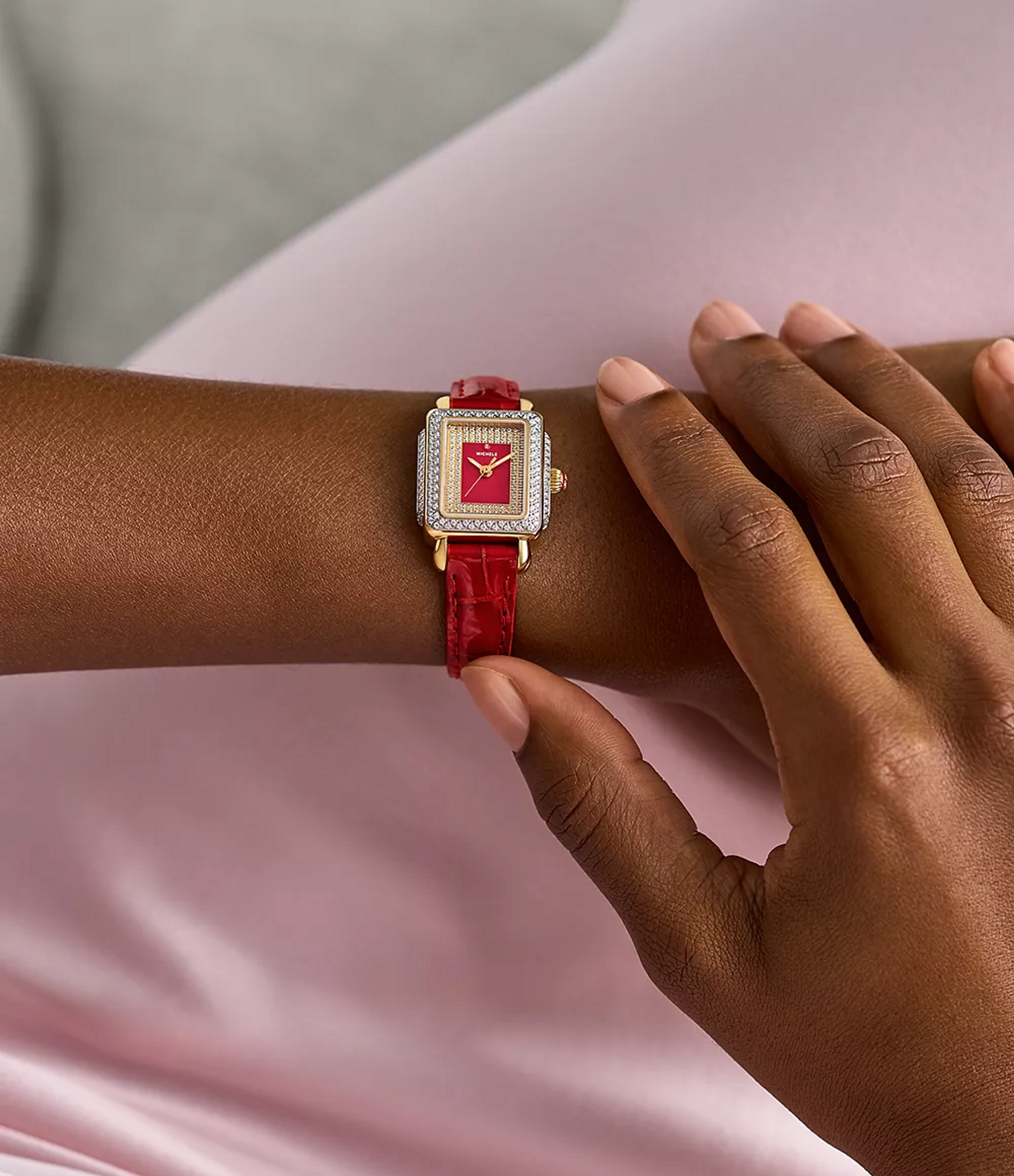 Elevate your style with the Special Edition Deco Madison Mini Diamond Pavé Dial watch. Designed for the modern woman, this two-tone 18K gold-plated rectangular timepiece dazzles with its red mother-of-pearl dial surrounded by 224 diamonds on the dial and bezel (0.66 carat weight) and a Swiss movement. The rich glossy leather strap adds the finishing touch.